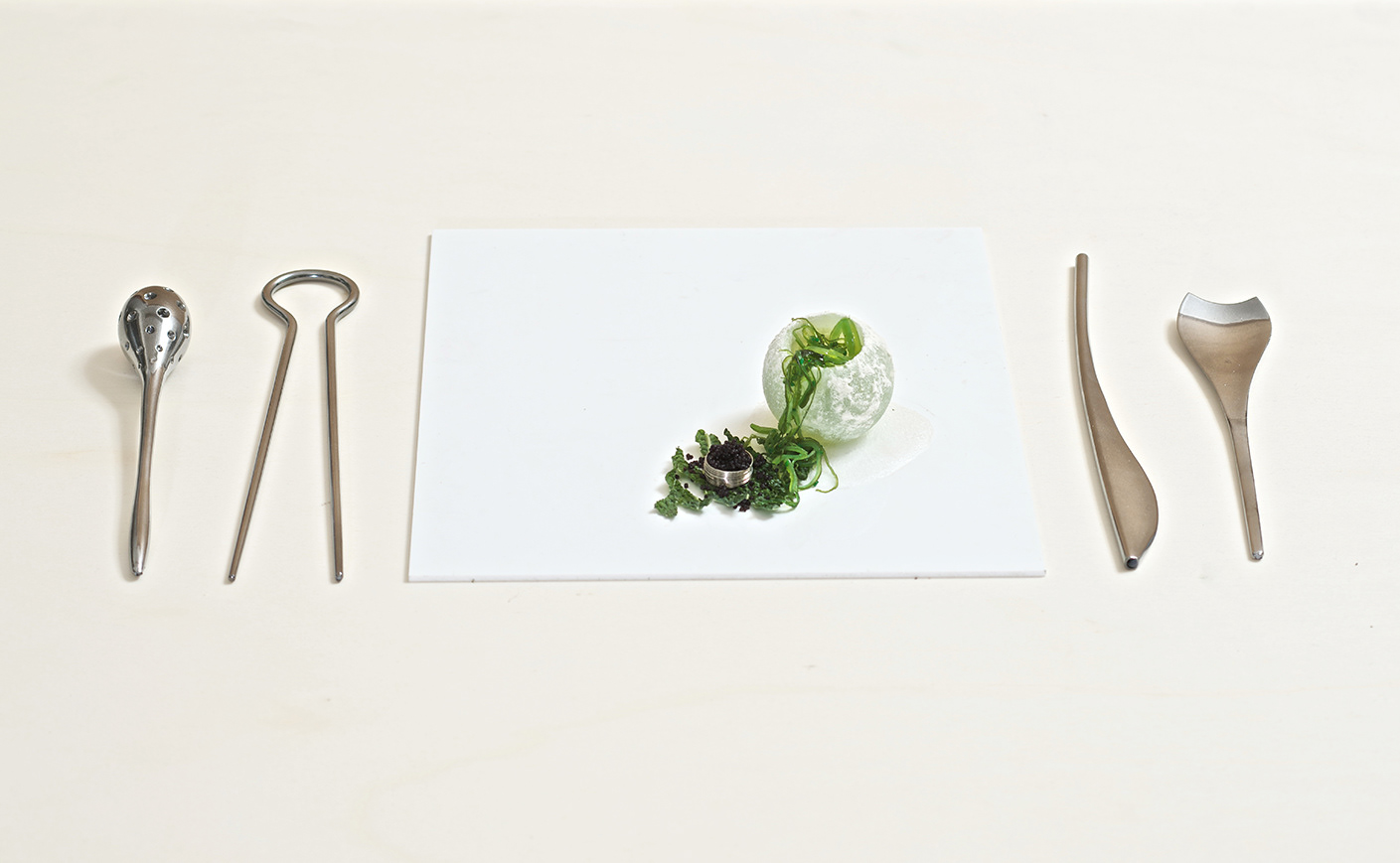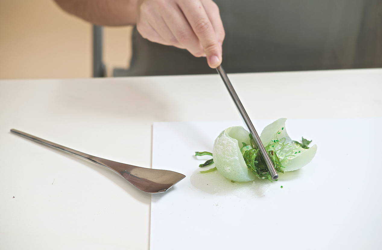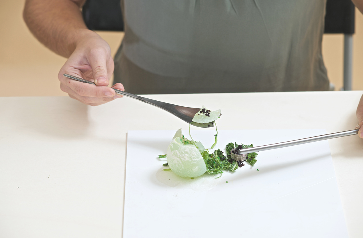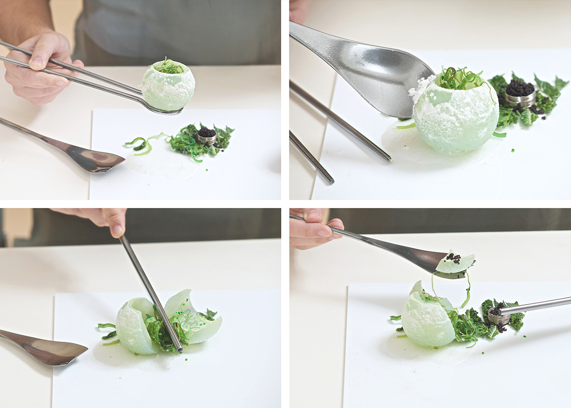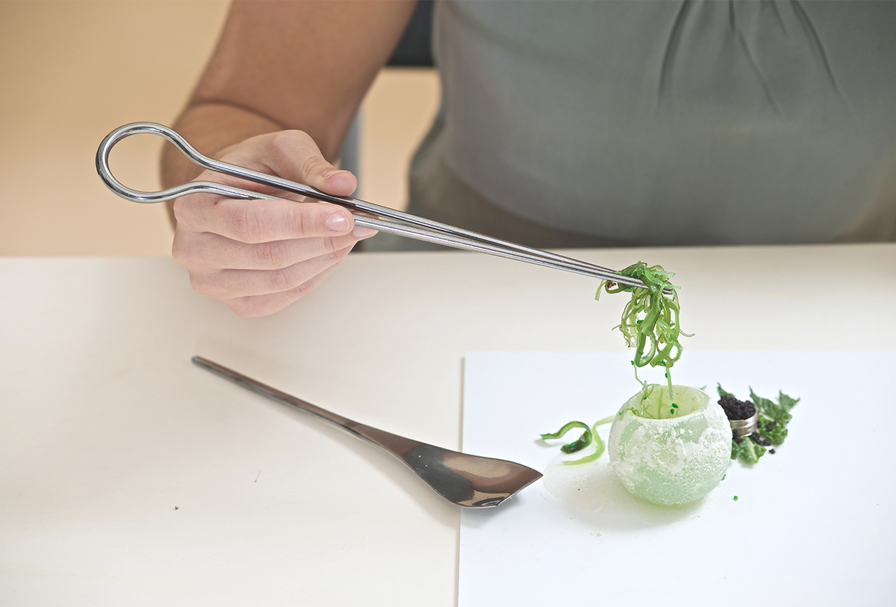 Fungi Cutlery was developed within the collaborative project "Fungi Mutarium" between Livin Studio and Utrecht University. It is designed specifically to eat agar "FUs", a novel food product based on agar (seaweed gelatin substitute) and fungi mycelium. "With every new type of dining, there comes a certain etiquette." DRIP DROPPER Scratch the fungi off the wall of this sensual cutlery and simultaneously mix with the sweet or sour sauce that tops your favorite agar FU. ROUND CHOPS Round Chops has two functions. It is used like chopsticks to take pieces as well as it is used as a holder for the FU. It is the most social one of the cutlery set, wanting you to hand over the FU on top to your dinner partner. HOLLKNIFE Conquer and cut the FU into pieces with the elegantly shaped hollknife. Don´t let the sauce go away either and soak it up through the straw function. MOON SPOON The shape of the moon spoon glides along your agar FU to reach even the tiniest fungi fruit bodies on it. It can also be loaded with the delicious agar „meat“. Credits: Unger, Kaisinger