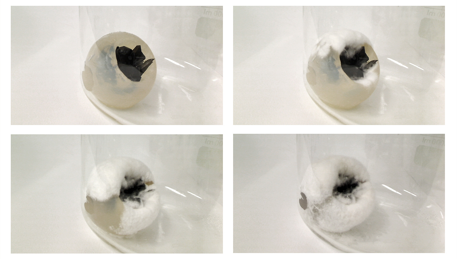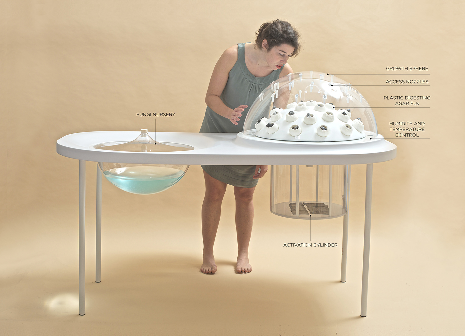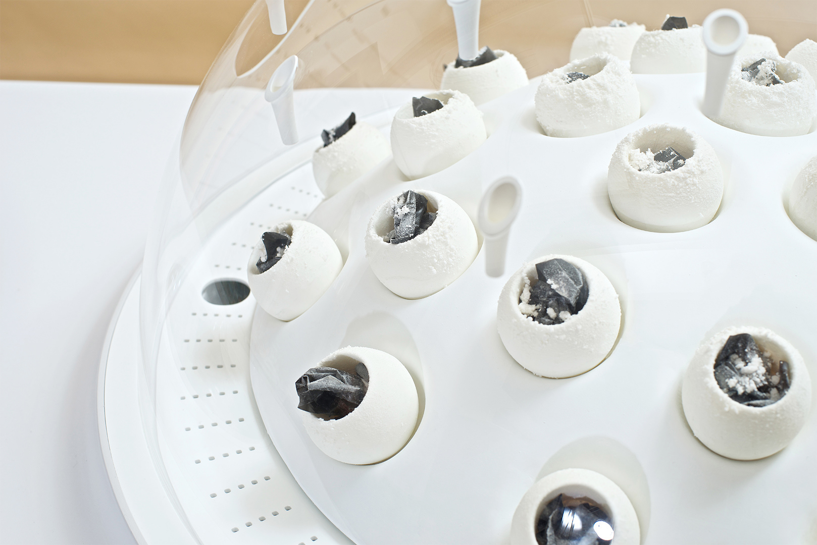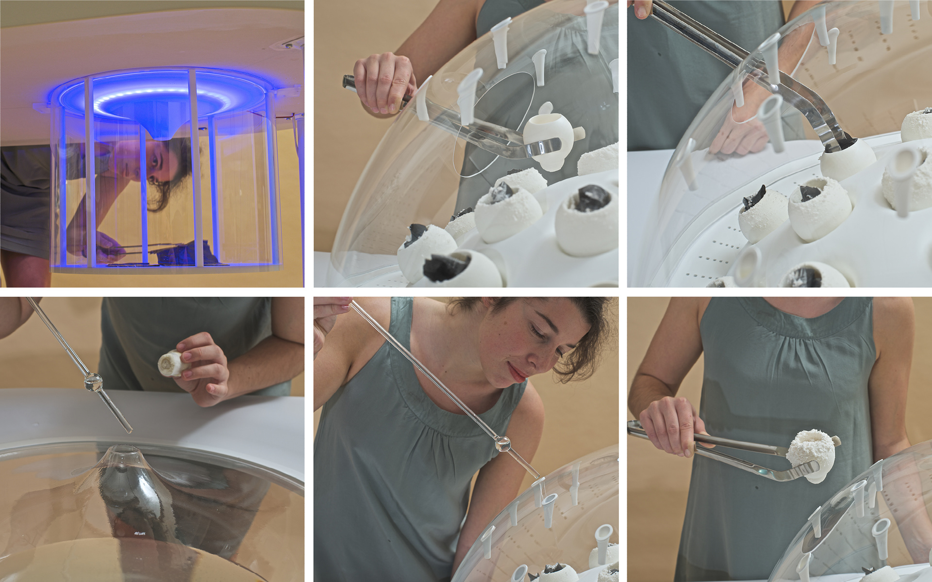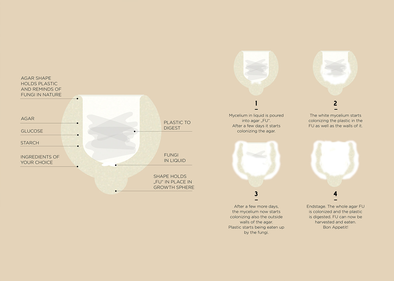 Livin Studio has, in collaboration with Utrecht University, developed a novel fungi food product grown on (plastic) waste, a prototype to grow it and culinary tools to eat it. Please go to FUNGI CUTLERY to explore our culinary tools developed throughout this project. Fungi Mutarium is a prototype that grows edible fungal biomass, mainly the mycelium, as a novel food product. Fungi is cultivated on specifically designed agar shapes that the designers called "FU". Agar is a seaweed based gelatin substitute and acts, mixed with starch and sugar, as a nutrient base for the fungi. The "FUs" are filled with plastics. The fungi is then inserted, it digests the plastic and overgrows the whole substrate. The shape of the "FU" is designed so that it holds the plastic and to offer the fungi a lot of surface to grow on. Its shape has been developed inspired by mushrooms and other plants in nature. The user should be reminded of harvesting mushrooms in the wild when harvesting the "FUs". This project was funded by the Bio Art and Design Award and generously supported by Utrecht University. The Bio Art and Design Award is a collaboration between NWO (Dutch Research Council- Earth and Life Science, Humanities, The Hague), ZonMW (Medical Research Council, The Hague), MU Artspace (Eindhoven) and Waag Society (Amsterdam). credits of project: Katharina Unger and Julia Kaisinger for LIVIN Studio research partner: Utrecht University, Prof. Dr. Han Wösten, Kasia Lukasiewiecz
