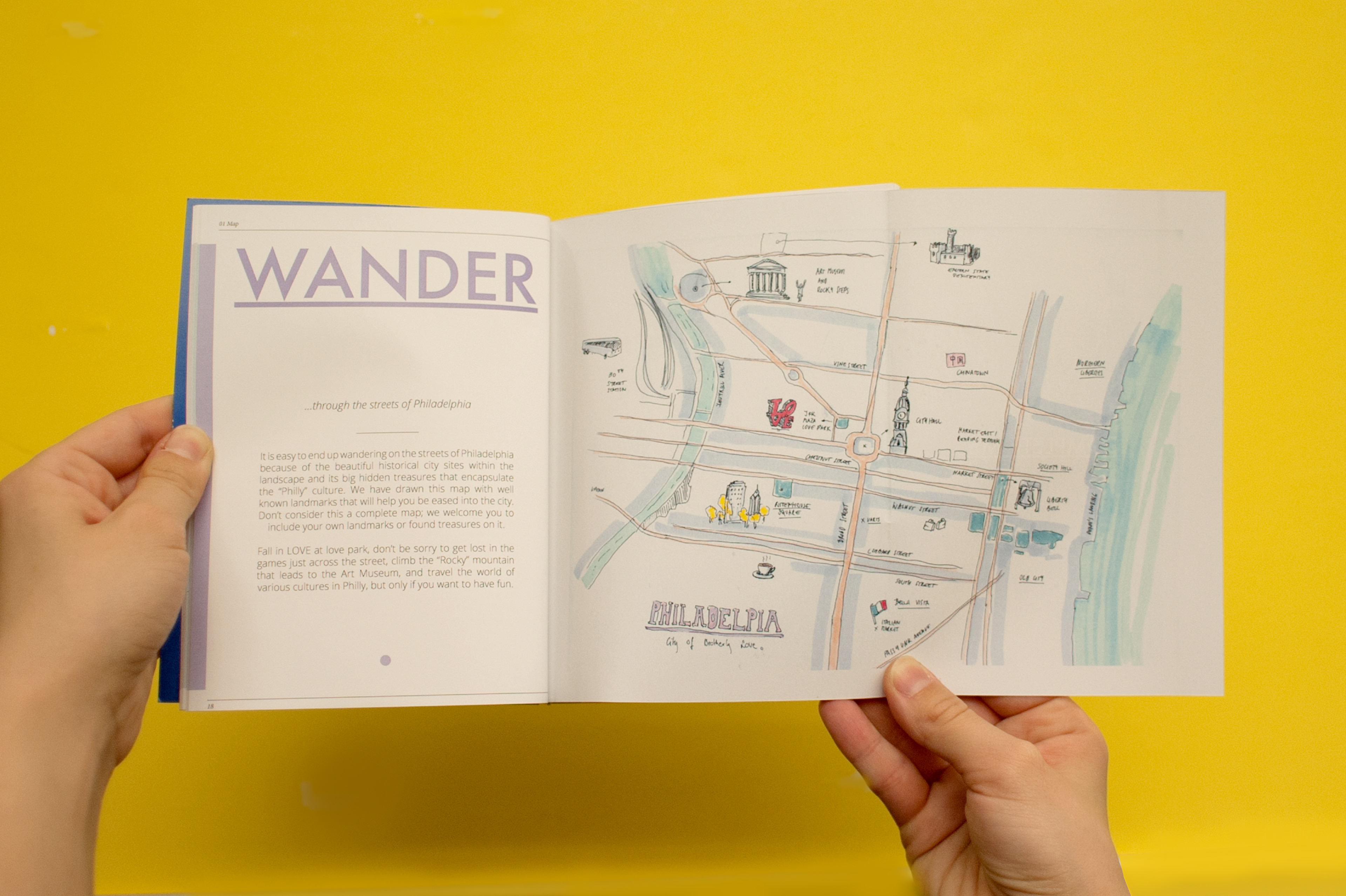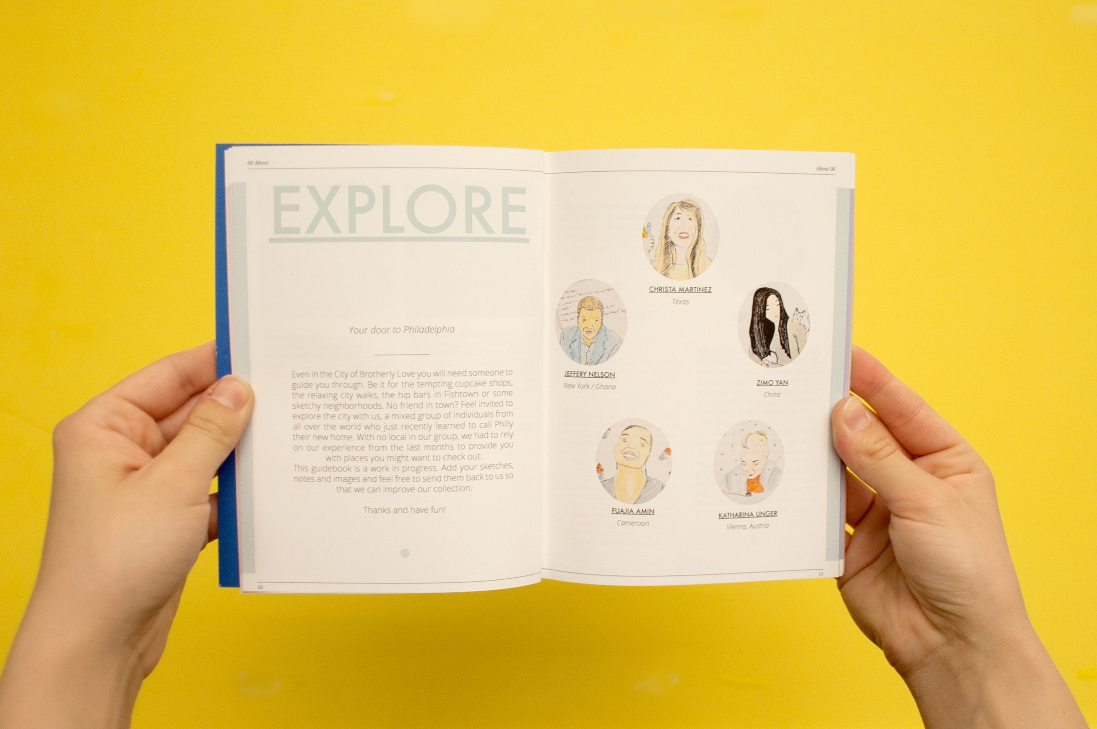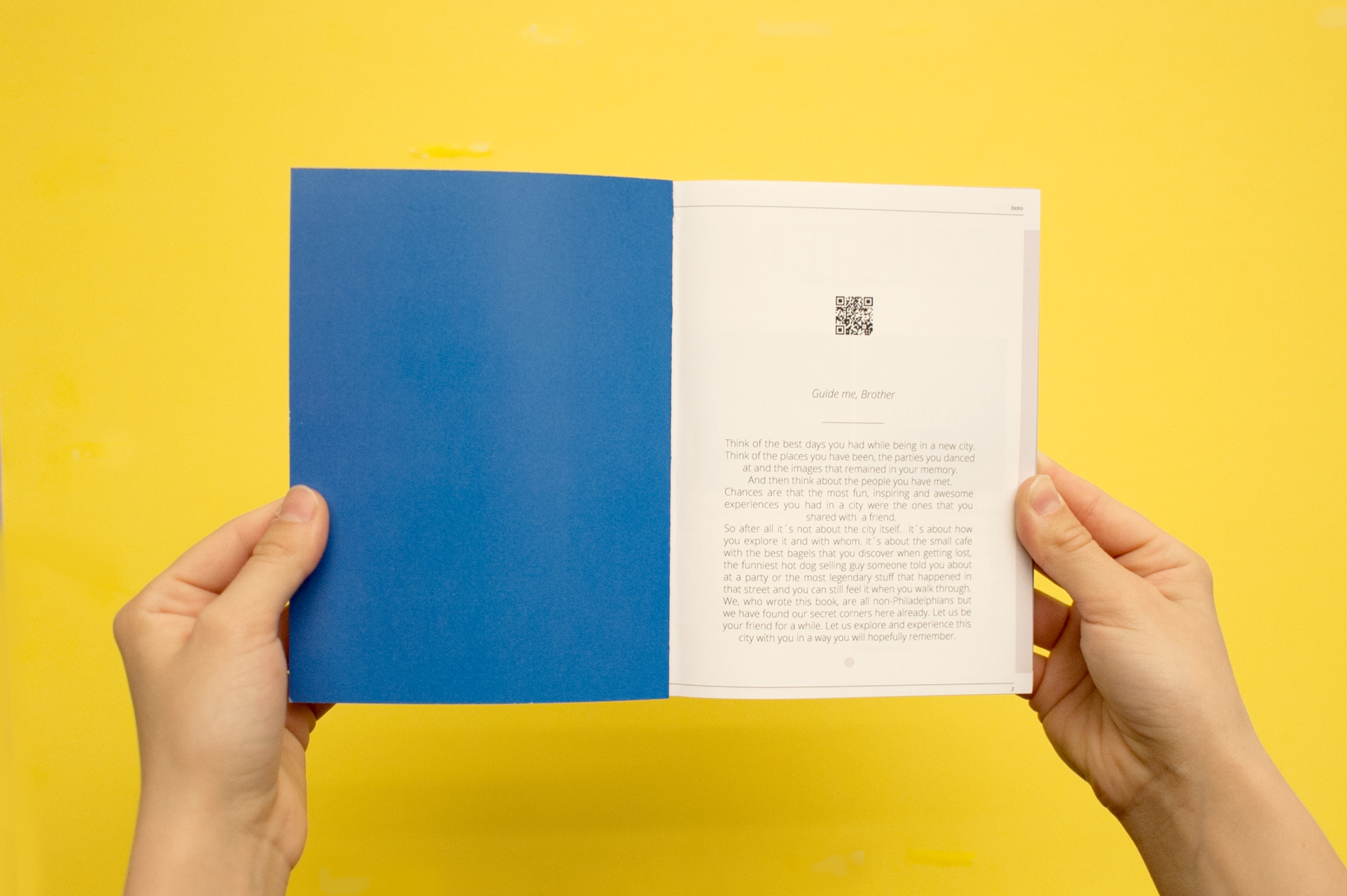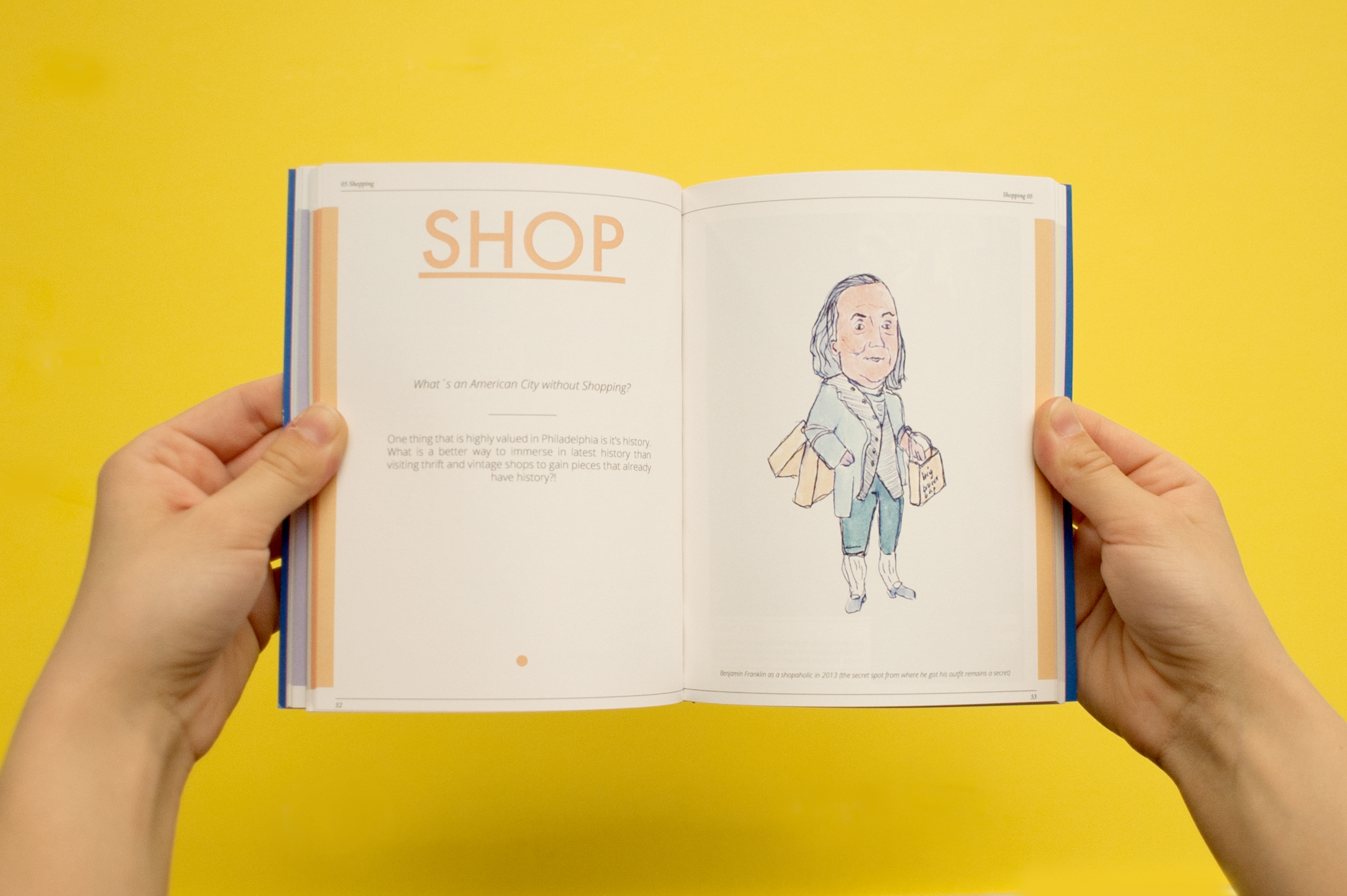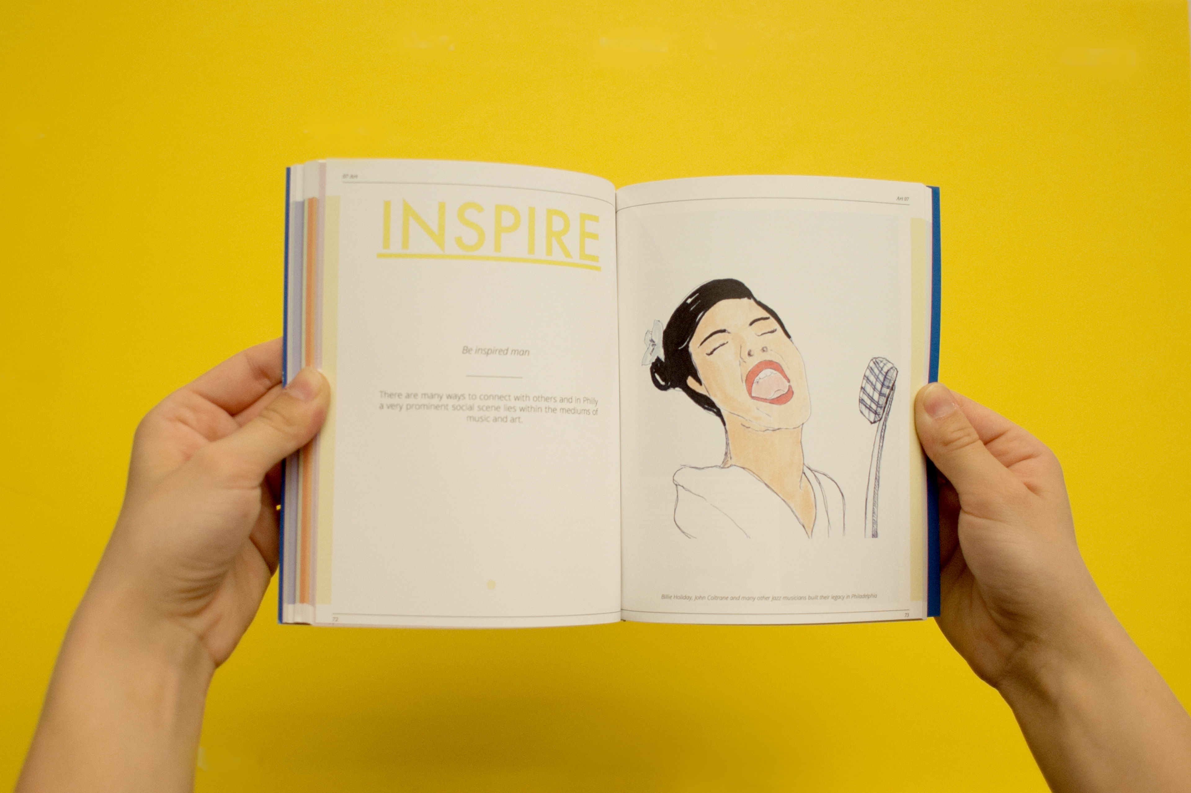 A guidebook made with love about the City of Brotherly Love. Always in the shadow of its glamorous big sister New York, Philadelphia is not really the most popular target for tourists or even Americans. The city as a whole has its dark sides, however, it can be surprisingly beautiful, funny and special. Our chosen slogan therefore was "Sometimes the sum of the parts is greater than the whole." Pointing out the secret spots of the city in a casual way, as if guided by a friend, was the goal of this guidebook. Explore, shop or rock the city like a local and find out about some big personalities that did their first steps in this city: Philly-locals like Bill Cosby, Billie Holiday and Will Smith appear on hand drawn illustrations. Note and blank pages, games and QR codes with videos or further information ask the reader to interact with the guidebook.