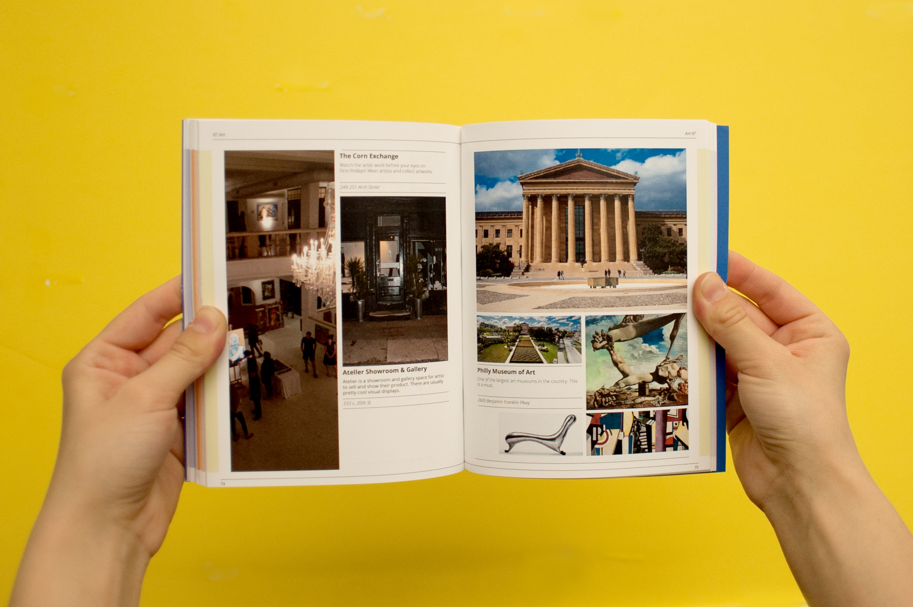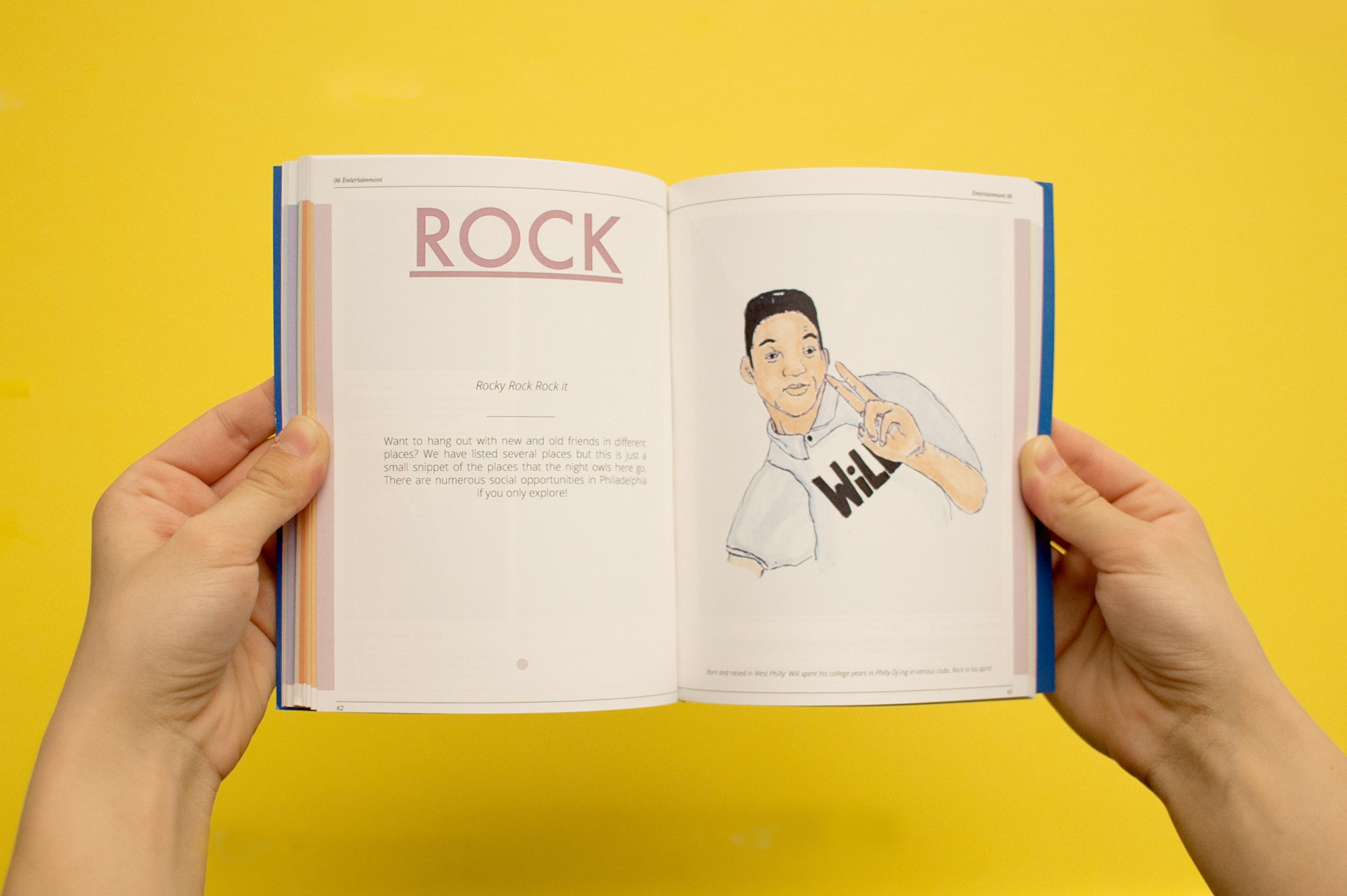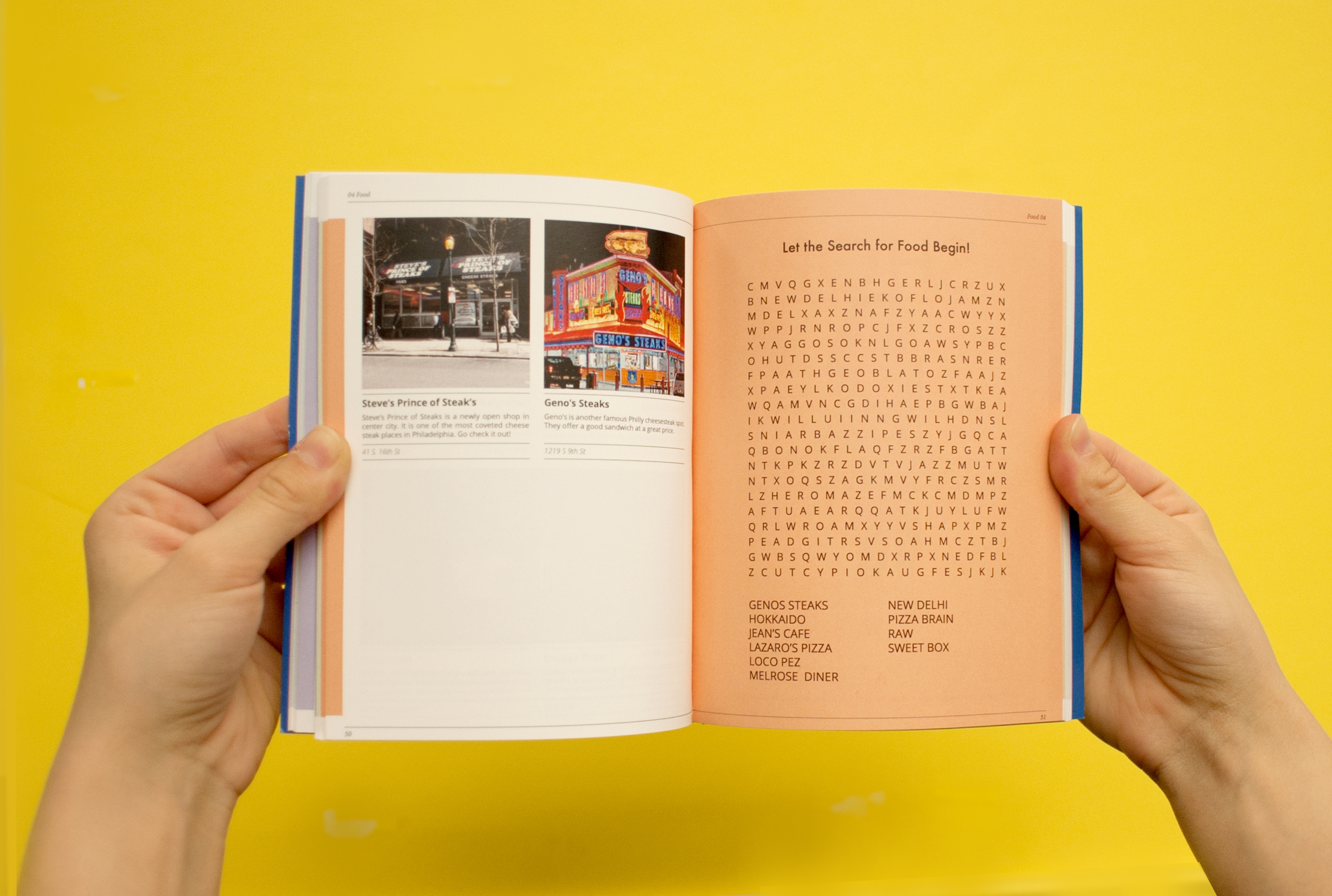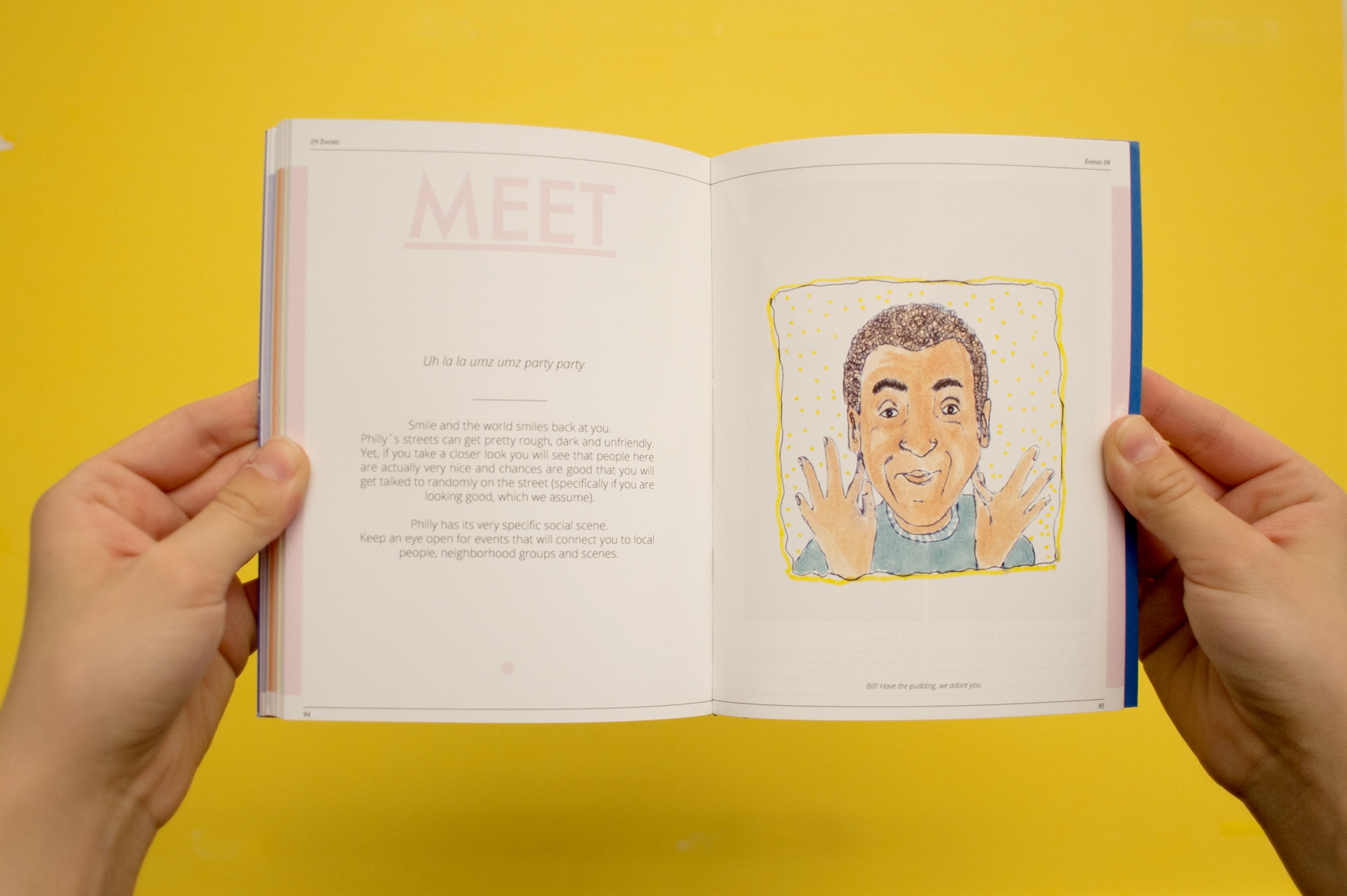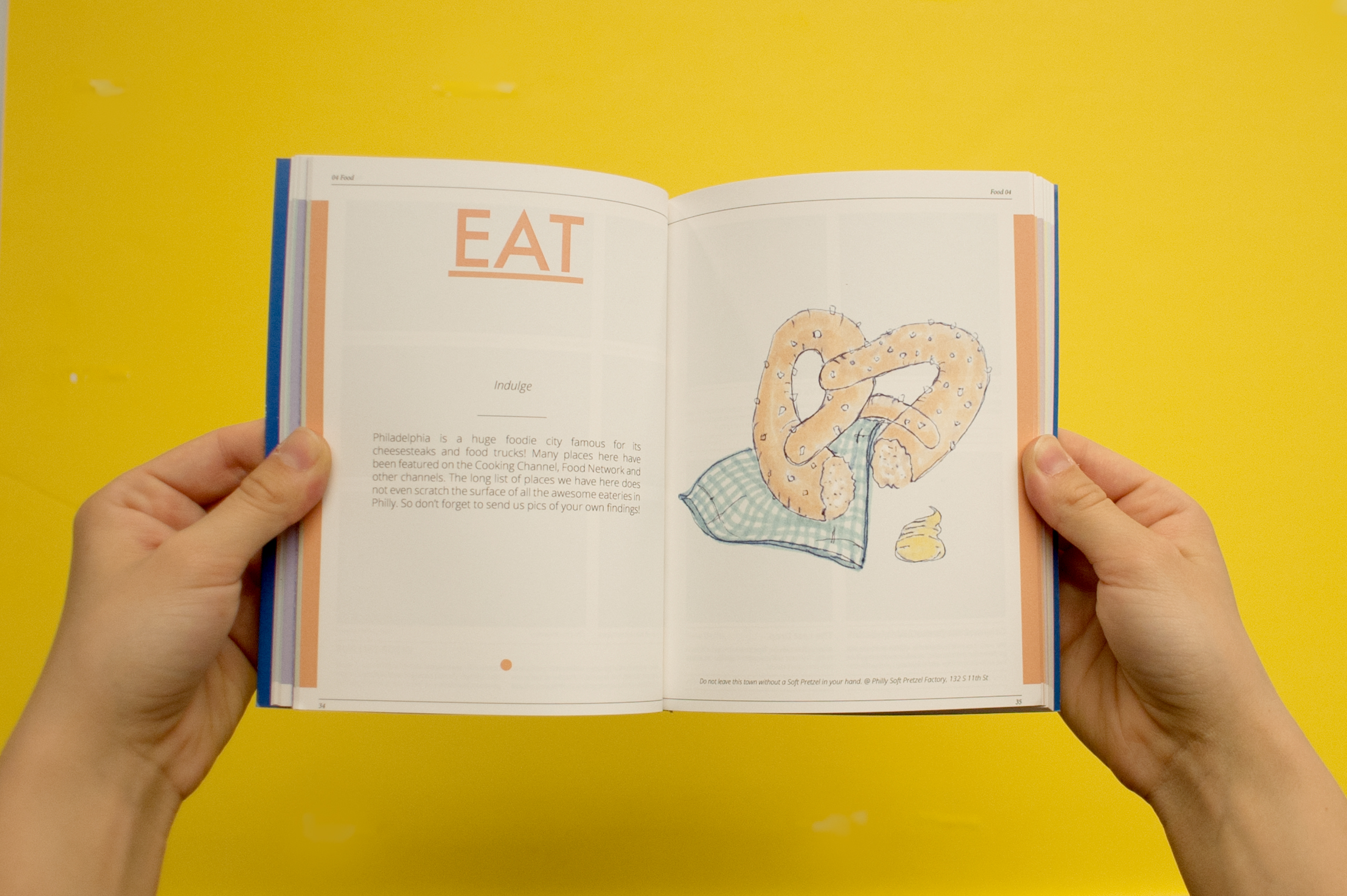 A guidebook made with love about the City of Brotherly Love. Always in the shadow of its glamorous big sister New York, Philadelphia is not really the most popular target for tourists or even Americans. The city as a whole has its dark sides, however, it can be surprisingly beautiful, funny and special. Our chosen slogan therefore was "Sometimes the sum of the parts is greater than the whole." Pointing out the secret spots of the city in a casual way, as if guided by a friend, was the goal of this guidebook. Explore, shop or rock the city like a local and find out about some big personalities that did their first steps in this city: Philly-locals like Bill Cosby, Billie Holiday and Will Smith appear on hand drawn illustrations. Note and blank pages, games and QR codes with videos or further information ask the reader to interact with the guidebook.